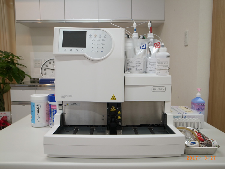 ❏ 当クリニックでは糖尿病の患者さんにHbA1c値や血糖値を即日その場で、しかもあまりお待たせすることなく報告できるように、最新のHbA1c/血糖値同時測定機器を導入しております。リアルタイムで得られた数値をもとに的確な血糖コントロール状況の判断を行い、治療に反映させます。