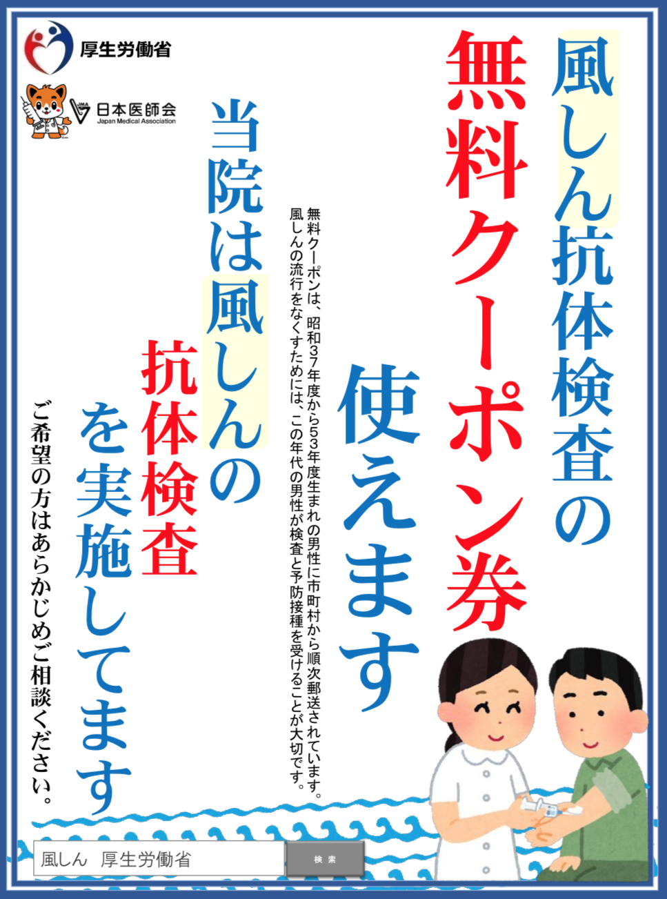- 当クリニックで厚生労働省事業で市町村が実施している風疹抗体価検査および風疹ワクチン接種が受けられます。あなたと、これから生まれてくる世代の子どもを守るために風疹の抗体検査と予防接種を受けましょう。窓口までお問い合わせください!